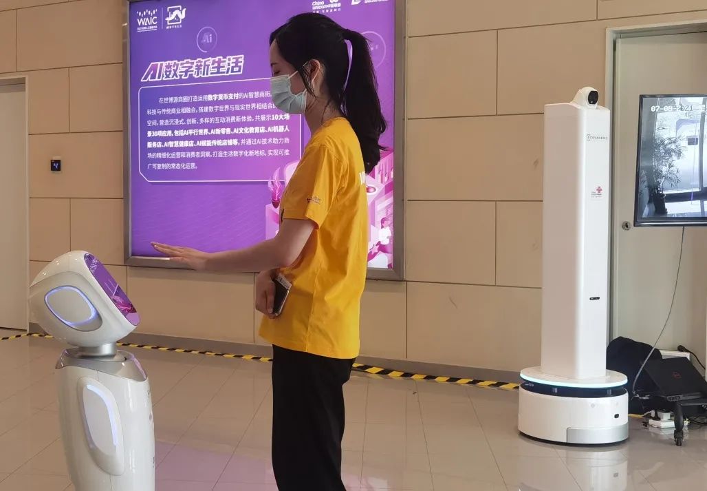 在世博源三區(qū)的入口處,“旺寶3”和測(cè)溫機(jī)器人“巡寶-T”為每一位來賓提供接待和防疫服務(wù)。