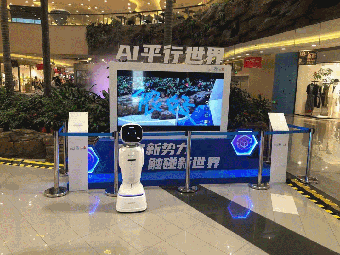 在B層的AI智慧商街內(nèi),旺寶儼然成為最忙的“業(yè)務(wù)員”:包括主動(dòng)問候、巡游講解、問路指引?!斑@里是‘AI平行世界’,打開手機(jī)的微信小程序,就能‘穿越’到一個(gè)平行的‘?dāng)?shù)字世界’——通過射擊、尋寶等小游戲,你能獲得專屬優(yōu)惠券?!蓖鷮氈鲃?dòng)向參展群眾推薦有趣多樣的智慧化成果,憑借高效精準(zhǔn)的移動(dòng)和避障能力、多模態(tài)語(yǔ)音交互能力和軟萌的外形,吸粉無數(shù)。