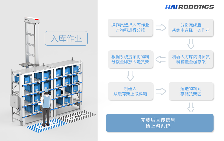 一期項目采用庫寶HAIPICK A42多層料箱機器人+緩存貨架/輸送線+機器人調(diào)度系統(tǒng)+操作臺系統(tǒng)的方式,讓庫寶HAIQ系統(tǒng)ESS層與寶時WMS系統(tǒng)對接,上游WMS系統(tǒng)進行任務分配下發(fā),庫寶RCS控制機器人根據(jù)下發(fā)任務完成存取料箱操作。項目流程如下:入庫:通過緩存貨架的方式,減少人機等待時間,提升入庫的效率。