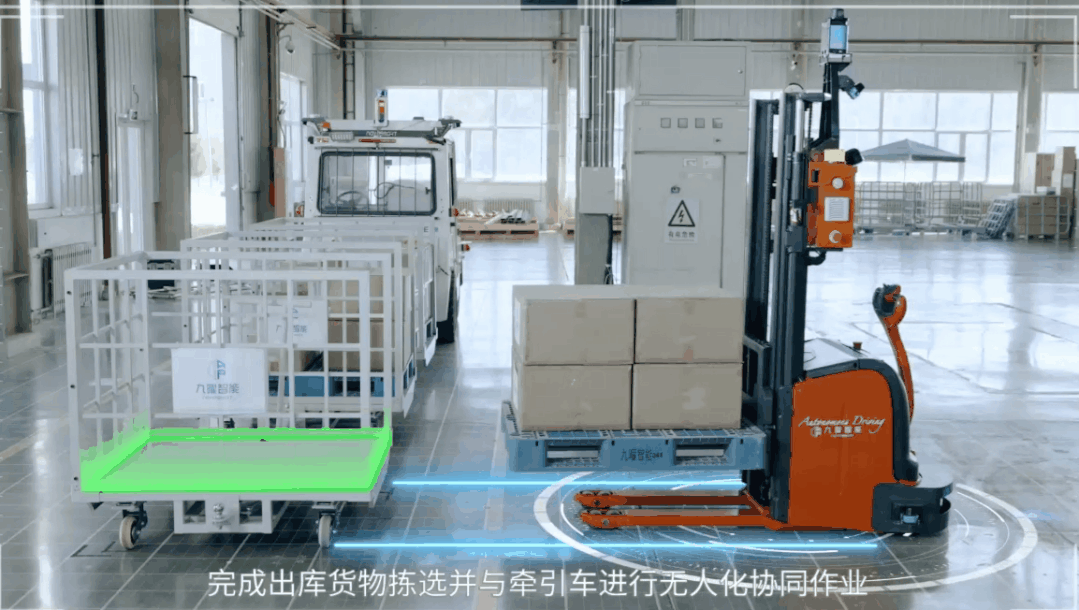 ④無(wú)人牽引車(chē)行駛至卸貨點(diǎn),通過(guò)與IWMS等業(yè)務(wù)系統(tǒng)對(duì)接,實(shí)現(xiàn)與AGV協(xié)同作業(yè),AGV卸貨上線