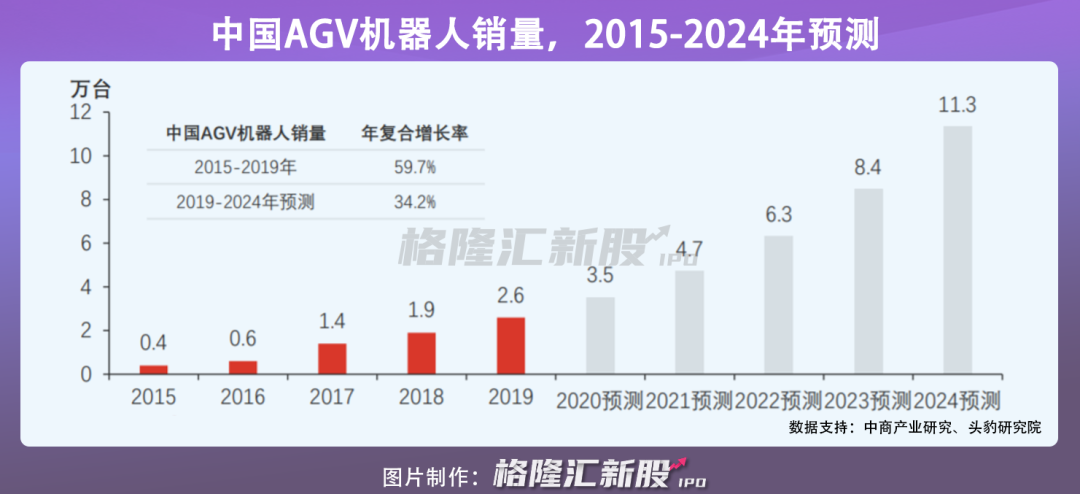 AGV核心零部件國產(chǎn)化技術得到突破后,降低了對海外企業(yè)的依賴,無人倉也一并加速實現(xiàn)?,F(xiàn)在,中國AGV產(chǎn)品規(guī)模效應逐漸擴大,2015-2019年AGV機器人銷量復合增長率為59.7%,并預計到2024年為34.2%。