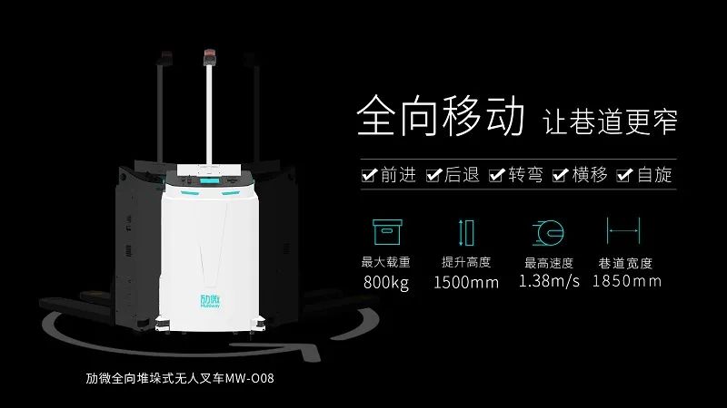 除全向堆垛式無人叉車外,勱微還擁有三向叉式無人叉車MW-K10、側(cè)叉式無人叉車MW-SF10等應(yīng)用于窄通道密集存儲場景產(chǎn)品。