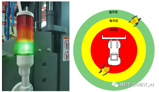 叉車式AGV上安裝聲光報(bào)警器,系統(tǒng)設(shè)置三級(jí)距離區(qū)域:提示區(qū)、警示區(qū)、限速區(qū)。當(dāng)障礙物進(jìn)入叉車式AGV的危險(xiǎn)作業(yè)半徑內(nèi)時(shí),該叉車防碰撞預(yù)警系統(tǒng)將會(huì)發(fā)出聲光報(bào)警,同時(shí)緊急制停。