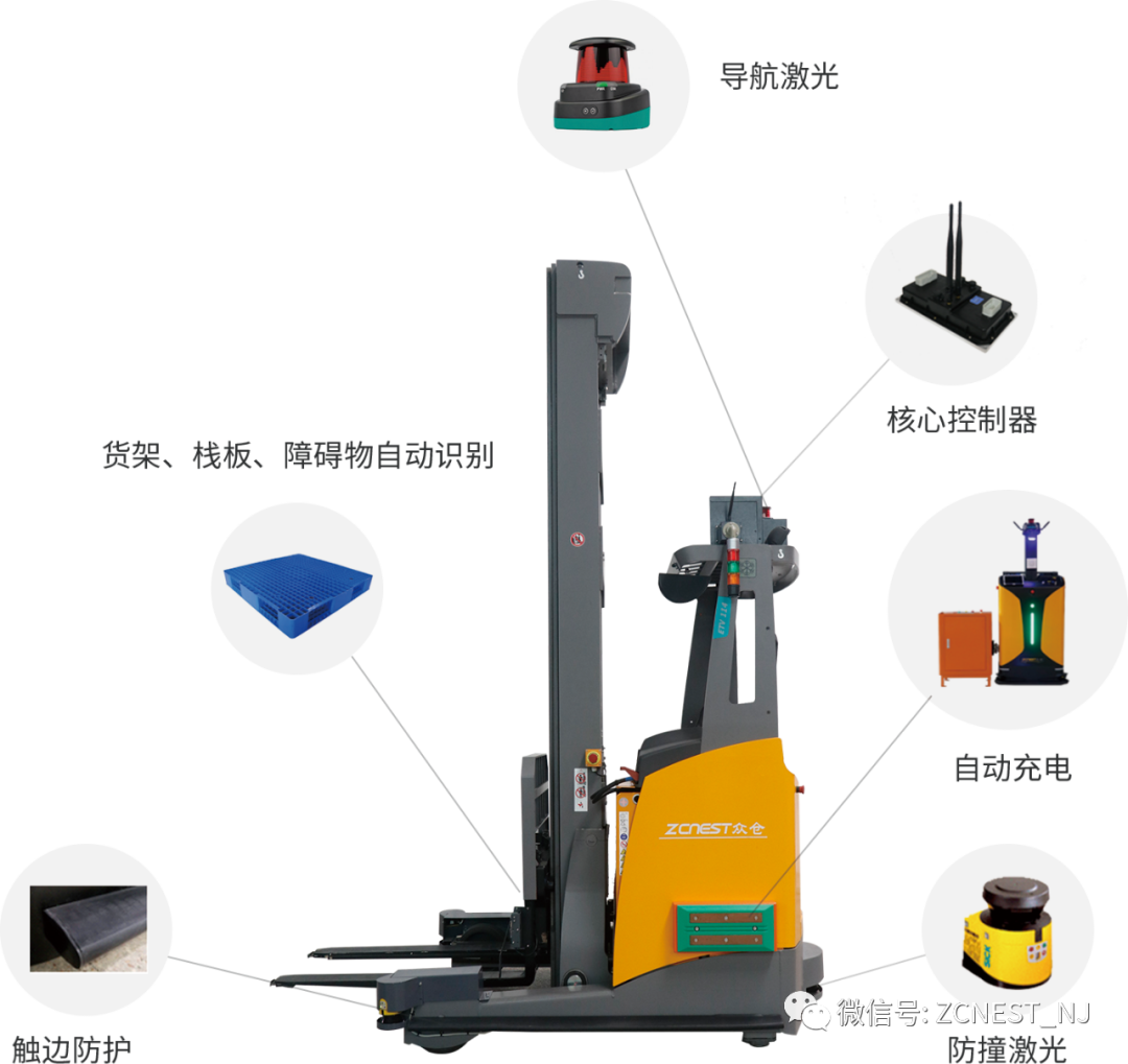 眾倉叉車式AGV內(nèi)置各種安全傳感器進(jìn)行避障防護(hù),采用非接觸式安全設(shè)計(jì),利用激光識(shí)別周邊障礙;通過多位傳感器組合可滿足360°平面障礙物檢測(cè)、270°立面障礙物感知,同時(shí)具備超速監(jiān)測(cè)、路徑優(yōu)化、安全限速等多種策略來應(yīng)對(duì)不同工況環(huán)境,提高場(chǎng)景內(nèi)的安全適配能力。