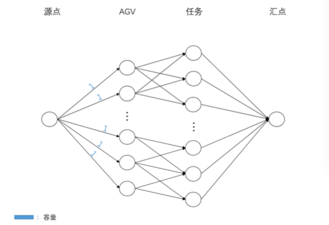 考慮一個典型的場景,每輛AGV僅可同時執(zhí)行一個任務(wù),那么每輛AGV到源點的容量均為1. 任務(wù)到匯點的各條邊容量顯然均為1. 如果某個任務(wù)能被某個AGV執(zhí)行,則有從該AGV到該任務(wù)的有向邊,其容量為1。每條邊的成本綜合一下幾點得出:(1)任務(wù)優(yōu)先級分數(shù)(2)AGV優(yōu)先級分數(shù) (3)搬運成本。