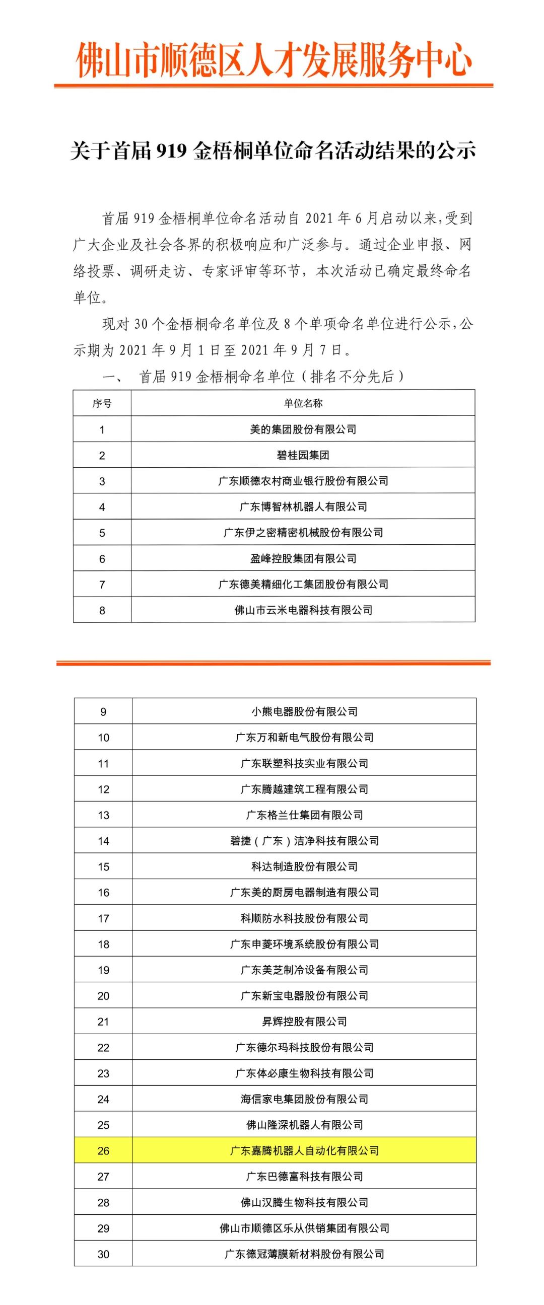 【喜報】嘉騰機器人榮獲首屆“919金梧桐單位”稱號