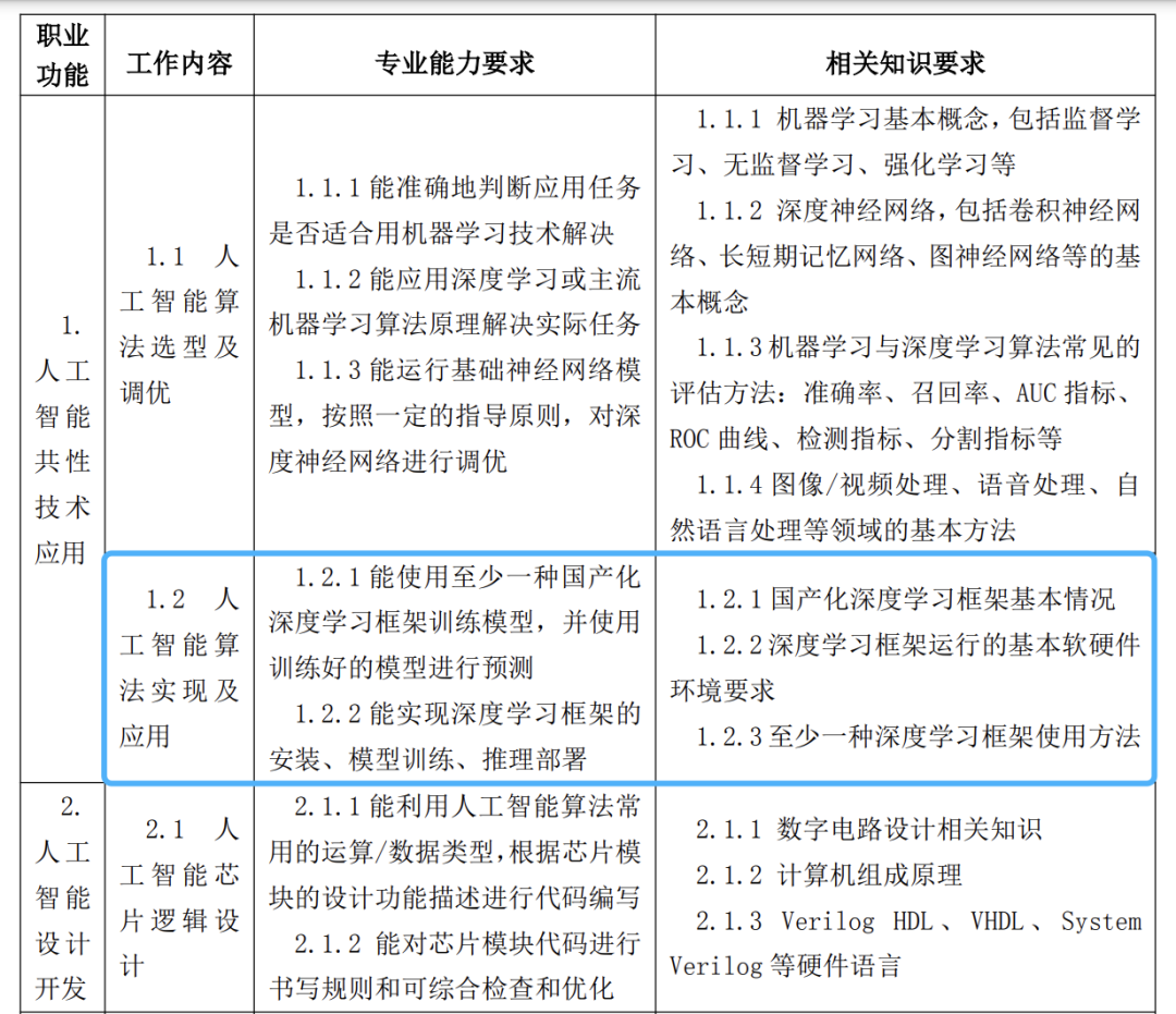 百度作為起草單位參與《人工智能工程技術(shù)人員國家職業(yè)技術(shù)技能標(biāo)準(zhǔn)》(以下簡稱“標(biāo)準(zhǔn)”)編寫。人工智能工程技術(shù)人員(職業(yè)代碼:2-02-10-09)是人社部2019年發(fā)布的高新技術(shù)領(lǐng)域新職業(yè),是指從事與人工智能相關(guān)算法、深度學(xué)習(xí)等多種技術(shù)的分析、研究、開發(fā),并對人工智能系統(tǒng)進(jìn)行設(shè)計、優(yōu)化、運(yùn)維、管理和應(yīng)用的工程技術(shù)人員。本標(biāo)準(zhǔn)對人工智能工程技術(shù)從業(yè)人員的專業(yè)活動內(nèi)容進(jìn)行規(guī)范,明確了初中高各等級專業(yè)技術(shù)人員的工作領(lǐng)域、工作內(nèi)容以及知識水平、專業(yè)能力和實(shí)踐要求。