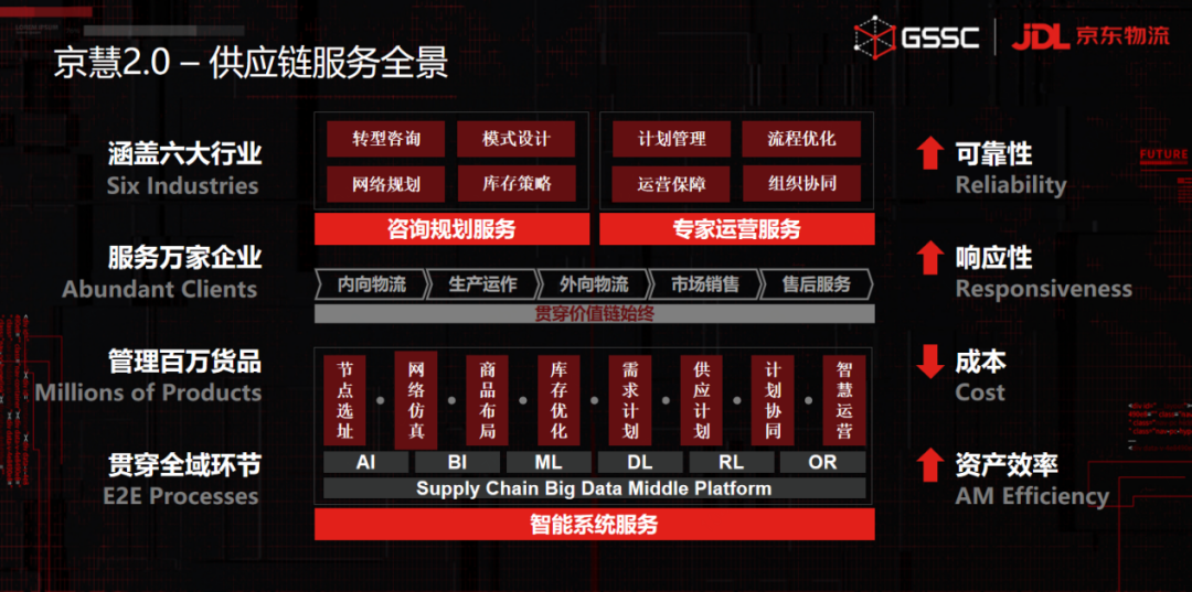 相比于1.0時(shí)期的軟件服務(wù)產(chǎn)品,京慧2.0著力打造的服務(wù)解決方案是從用戶需求精準(zhǔn)滿足為出發(fā)點(diǎn),逐漸從單環(huán)節(jié)系統(tǒng)服務(wù)走向整體運(yùn)營(yíng),關(guān)注點(diǎn)從“效率”向“效益”轉(zhuǎn)變,致力于通過(guò)供應(yīng)鏈設(shè)計(jì)、智能決策和精細(xì)化運(yùn)營(yíng)實(shí)現(xiàn)供應(yīng)鏈優(yōu)化,帶來(lái)價(jià)值增值,助力企業(yè)實(shí)現(xiàn)供應(yīng)鏈數(shù)智化的戰(zhàn)略轉(zhuǎn)型。據(jù)王強(qiáng)介紹,京慧2.0采用“1+2”的服務(wù)模式,其中“1”是指一套智能數(shù)字化系統(tǒng),可以支持企業(yè)的供應(yīng)鏈長(zhǎng)、中、短期規(guī)劃及計(jì)劃;“2”是指咨詢規(guī)劃服務(wù)與專家運(yùn)營(yíng)服務(wù),可以基于自身商業(yè)及供應(yīng)鏈轉(zhuǎn)型的成功經(jīng)驗(yàn)、對(duì)產(chǎn)業(yè)的深度理解和落地經(jīng)驗(yàn)、專家運(yùn)營(yíng)團(tuán)隊(duì)的實(shí)踐經(jīng)驗(yàn),為企業(yè)提供一站式、陪伴式的供應(yīng)鏈服務(wù)。截至目前,京慧2.0已經(jīng)在快消、服飾、3C、家電、家居、汽車等六大行業(yè)服務(wù)著數(shù)萬(wàn)家KA與中小微企業(yè)客戶,管理著百萬(wàn)量級(jí)的商品,為眾多企業(yè)帶來(lái)貫穿供應(yīng)鏈全域的效益改善,實(shí)現(xiàn)高可靠、高響應(yīng)、低成本、高效率的供應(yīng)鏈管理目標(biāo)。