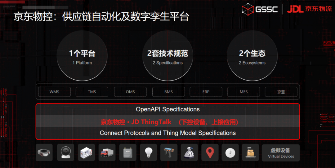 物,泛指所有智能終端和傳感器;控,指智能化與自動(dòng)化控制。作為一個(gè)面向供應(yīng)鏈自動(dòng)化、數(shù)字孿生的軟件平臺(tái),全新推出的京東物控平臺(tái)通過(guò)開(kāi)放的技術(shù)規(guī)范,下控設(shè)備、上接應(yīng)用,鏈接起設(shè)備終端生態(tài)與應(yīng)用生態(tài),提供供應(yīng)鏈自動(dòng)化和數(shù)字孿生方案,助力供應(yīng)鏈物流數(shù)智化升級(jí)。