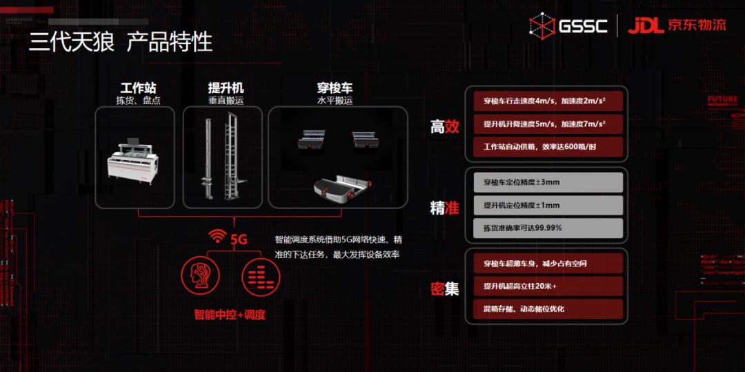 基于軟硬件的技術(shù)升級(jí),三代天狼系統(tǒng)的行走速度和加速度都達(dá)到國(guó)內(nèi)領(lǐng)先水平,提升機(jī)的加速度可做到7m/s2,速度到達(dá)5m/s;而在設(shè)備運(yùn)行精度及識(shí)別精準(zhǔn)方面,三代天狼也達(dá)到行業(yè)領(lǐng)先水平,最高可達(dá)±1mm,配合軟件調(diào)度系統(tǒng),縮短設(shè)備間的交互時(shí)間,最大化發(fā)揮設(shè)備效率。此外,三代天狼系統(tǒng)的存儲(chǔ)坪效上采用超薄車身設(shè)計(jì)、框架式超高提升機(jī),大幅提升存儲(chǔ)密度,提升機(jī)的提升高度可達(dá)20米,同時(shí)三代天狼系統(tǒng)實(shí)現(xiàn)了大小箱混合存儲(chǔ),配以動(dòng)態(tài)儲(chǔ)位調(diào)整。三代天狼系統(tǒng)以其高效:揀貨效率提升3-5倍,精準(zhǔn):揀貨準(zhǔn)確率提升至99.99%,密集:?jiǎn)挝幻娣e存儲(chǔ)密度提升3倍的三個(gè)產(chǎn)品亮點(diǎn),更好的服務(wù)外部客戶。