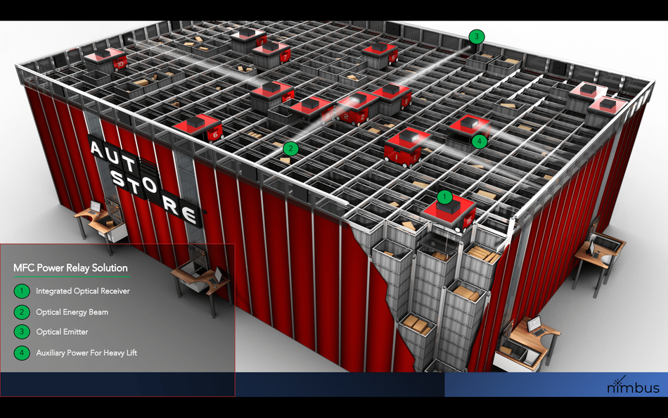 為了緩解這些痛點(diǎn),Nimbus工程公司已經(jīng)為AMR開(kāi)發(fā)了無(wú)接觸充電解決方案,可以減少機(jī)載電池容量要求,并減少充電事件的停機(jī)時(shí)間。Nimbus的電力繼電器技術(shù)(PRT)在需要的地方和時(shí)間將入射光線轉(zhuǎn)換為有用的能量。
