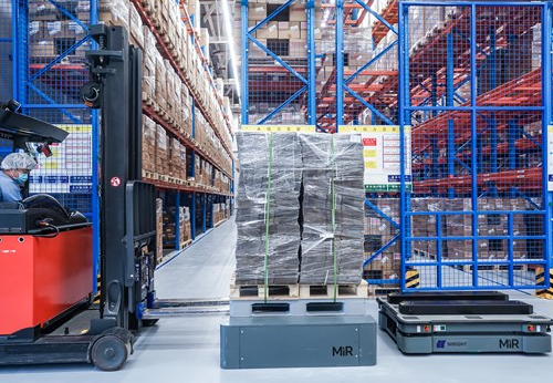 丹麥生物制藥公司諾和諾德的天津工廠就是一個(gè)用AMR替代叉車的例子。該廠房的收貨區(qū)和倉庫間隔100米,中間有多個(gè)彎道和人員密集區(qū)。過去,廠房使用叉車運(yùn)送物料每天至少需要 5 小時(shí),在生產(chǎn)高峰期需時(shí)更是超過 8 小時(shí)。而在到達(dá)倉庫存儲(chǔ)區(qū)后,人工叉車將把物料托盤搬運(yùn)至高層貨架處,然后使用專用叉車將托盤抬起放置到貨架上,導(dǎo)致現(xiàn)場(chǎng)存在叉車安全威脅。為應(yīng)對(duì)這一問題,諾和諾德引入了 5 臺(tái)MiR500移動(dòng)機(jī)器人,將物料從貨車卸載至其機(jī)架上后自主導(dǎo)航找尋最優(yōu)路線運(yùn)往倉庫存儲(chǔ)區(qū)。到達(dá)存儲(chǔ)區(qū)后,MiR500將把物料托盤搬運(yùn)至高層貨架處。在物料卸下后,才使用專用高層貨架叉車將物料放置在高層貨架儲(chǔ)存。整個(gè)流程不僅每周可節(jié)省至少 35 小時(shí)的人工工時(shí),更大幅提升了安全性。
