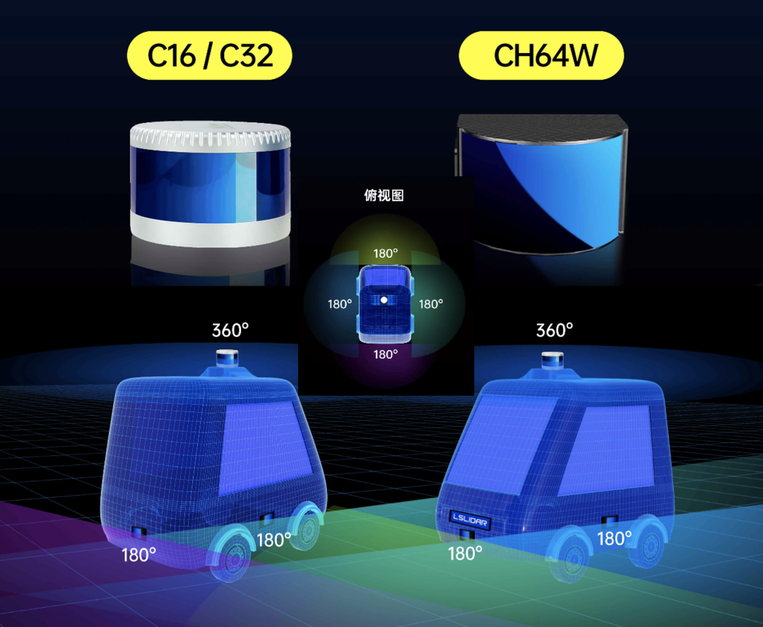 ● 車規(guī)混合固態(tài)+機械式多線激光雷達組合方案4*CH64W+1*C16/C32機械式多線激光雷達