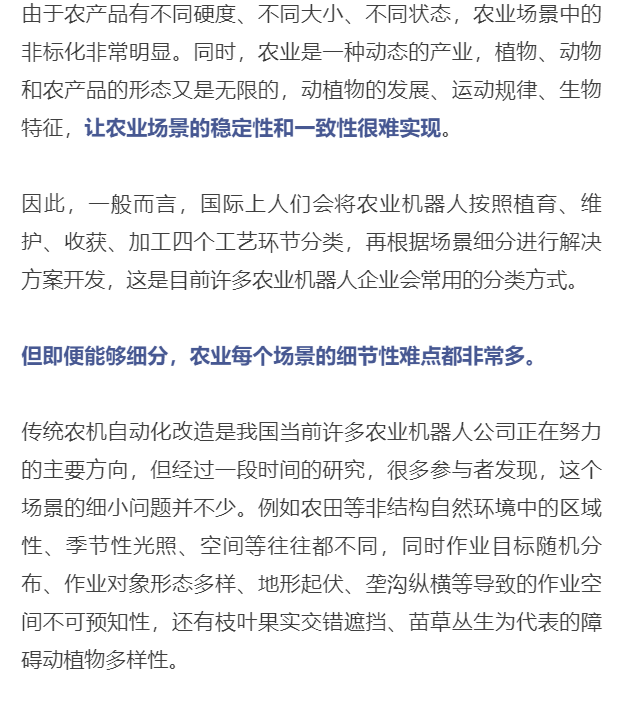 細(xì)節(jié)性難點(diǎn)頗多農(nóng)業(yè)機(jī)器人種類潛力巨大通用性的技術(shù)傳感技術(shù)、自動化技術(shù)、信息技術(shù)是農(nóng)業(yè)機(jī)器人發(fā)展的三個核心。更長遠(yuǎn)的買單問題農(nóng)業(yè)機(jī)器人必然是一筆長期投資。短期收益可能跟不上,但發(fā)展?jié)摿?..
