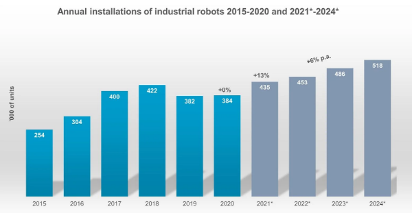 展望未來,全球經(jīng)濟預(yù)計將在2021年增長+6%,2022年增長+4.5%。本版WR預(yù)測,在2020年,全球機器人安裝量將強勁反彈+13%,達(dá)到43.5萬臺,這是由2020年以來推遲的投資、對有彈性的供應(yīng)鏈日益增長的需求以及為了支持產(chǎn)能擴張所驅(qū)動。在全球范圍內(nèi),"危機后的繁榮 "預(yù)計將在2022年有所緩和。從2021年到2024年,我們可以預(yù)期年平均增長率在中等個位數(shù)范圍內(nèi)。全球每年安裝50萬臺的大關(guān)預(yù)計將在2024年達(dá)到。