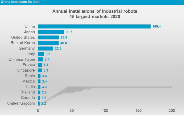 ▲ 各國安裝工業(yè)機器人數(shù)量(單位:1000臺)(來源:IFR)