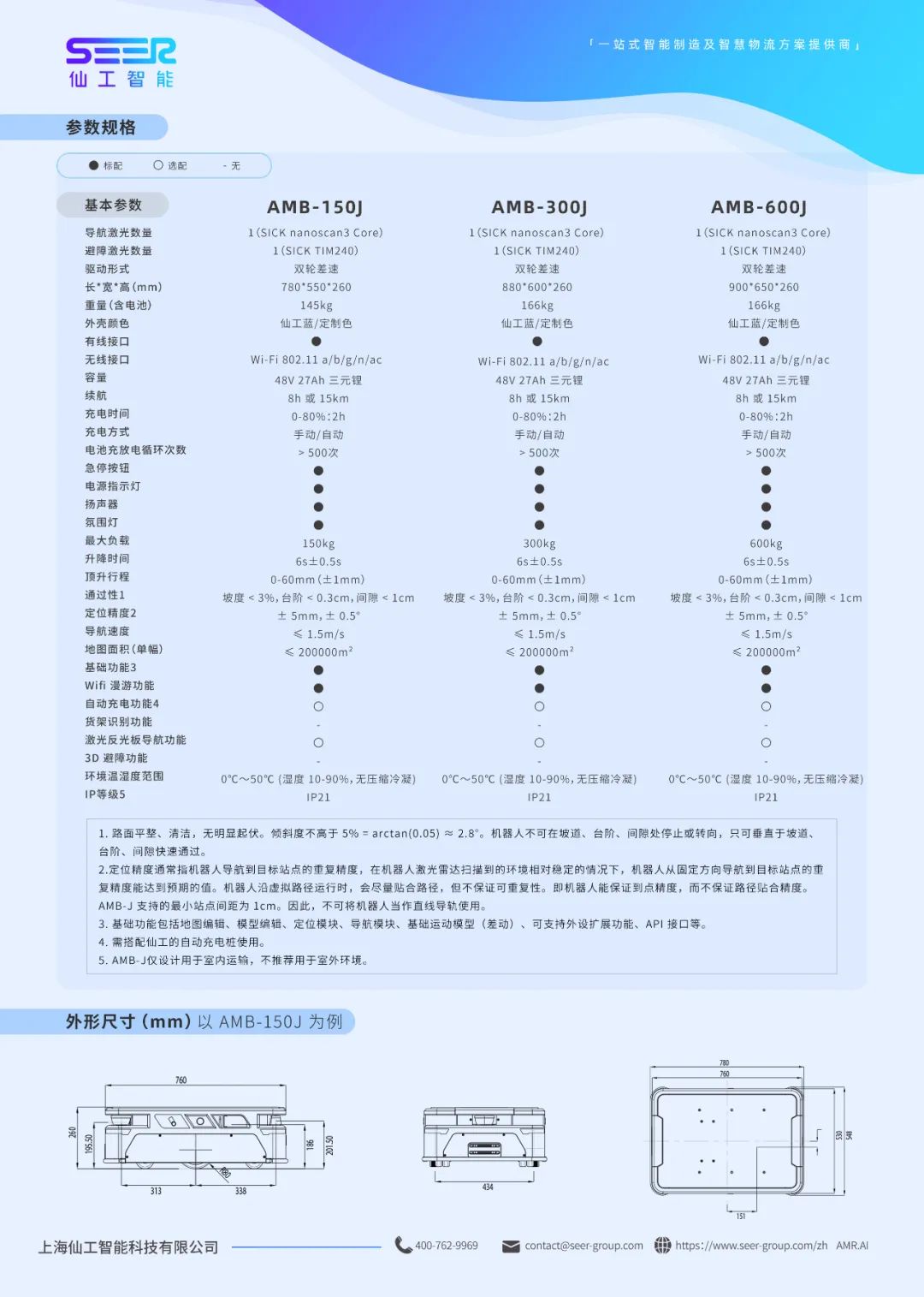 在產(chǎn)品的長期使用過程中,客戶們會不斷發(fā)掘產(chǎn)品的各種屬性,并提出一些新的需求。仙工智能傾聽不同的聲音,針對性地對產(chǎn)品做出改進,在不斷地升級中,幫助客戶解決更多實質(zhì)性的問題,以標準化產(chǎn)品支撐非標方案。AMB-J 產(chǎn)品參數(shù)