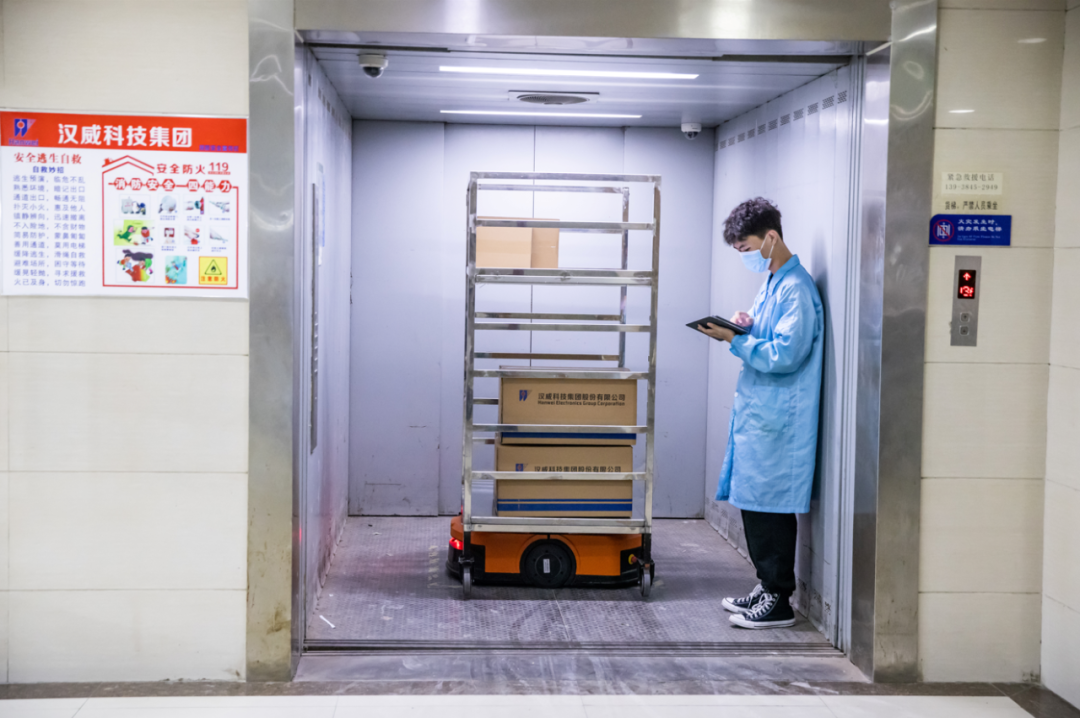 整個工廠都是單通道,可用空間有限,物流設(shè)備和人需要共用貨梯,同時物流設(shè)備需具備自主充電、跨樓層任務(wù)執(zhí)行的功能,并且需實現(xiàn)識別電梯內(nèi)的人或貨物,避免發(fā)生安全事故。