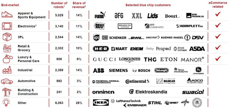 雖然Ocado 的目標(biāo)是雜貨零售商,但AutoStore 的跨行業(yè)多元化程度要高得多。一些著名的AutoStore 客戶包括Best Buy、ASDA、Siemens、Ikea、UPS、John Deere 和DHL。