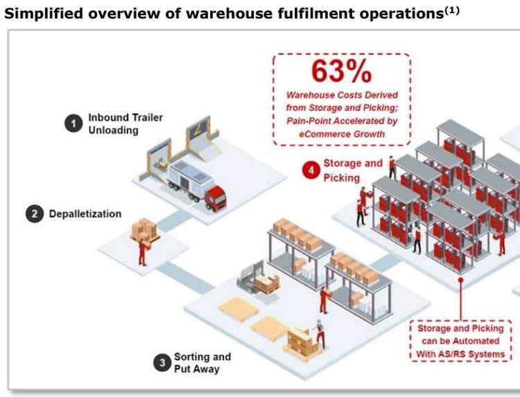 該公司的歷史可以追溯到1996年,故事真正開始于2019年,當(dāng)時(shí)私募股權(quán)公司Thomas H. Lee Partners(THL)收購了AutoStore,然后將該公司40%的股份出售給軟銀(THL仍然擁有AutoStore略高于50%的股份)。冗長(zhǎng)的492頁AutoStore IPO招股書提供了美元的財(cái)務(wù)信息,這是非常方便的,但由于正在合并的法律結(jié)構(gòu)(Automate LuxCo和Terminator)相當(dāng)混亂,所以閱讀起來很困難。拋開這些雜亂無章的東西,我們看到的是一家專注于倉庫主要痛點(diǎn)的公司--存儲(chǔ)和分揀--占倉庫運(yùn)營(yíng)成本的63%。