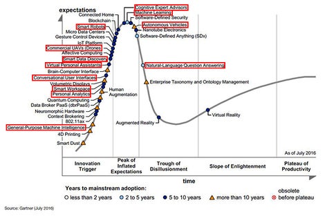 許多與AI 相關(guān)的技術(shù)正在接近或已經(jīng)達到Gartner 炒作周期中的“期望過高的峰值”,而由強烈反對驅(qū)動的“幻滅低谷”正在等待中。