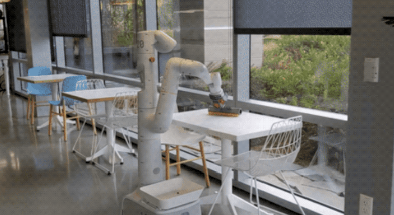 Alphabet 的一臺(tái) Everyday Robot 機(jī)器清理咖啡桌上的碎屑。圖片來(lái)源:Alphabet