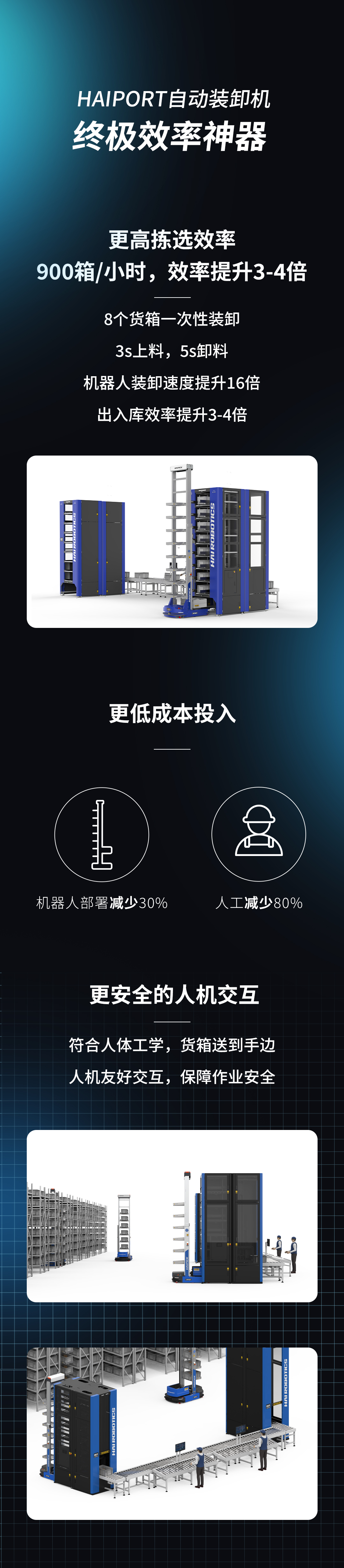 針對(duì)這一痛點(diǎn),可減少30%機(jī)器人部署,降低66%人力成本,提高3-4倍揀選效率的海柔創(chuàng)新于2020年全球首發(fā)產(chǎn)品——HAIPORT自動(dòng)裝卸機(jī)震撼面世,2021再度革新升級(jí),亮相2021CeMAT亞洲物流展。