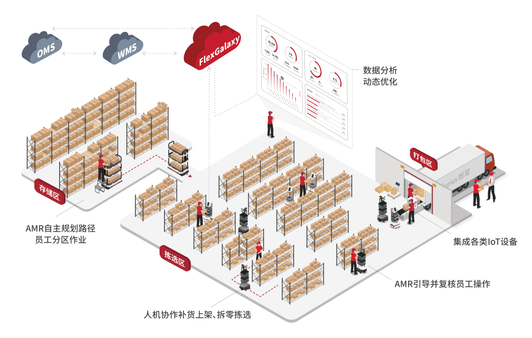 在Syrius炬星真柔性整倉解決方案中,AMR的工作任務(wù)基于FlexGalaxy云服務(wù)平臺,F(xiàn)lexGalaxy深度接入倉庫管理系統(tǒng),得以打通庫內(nèi)整體信息流,同時調(diào)整AMR作業(yè)流程、調(diào)度AMR集群,提升作業(yè)效率。