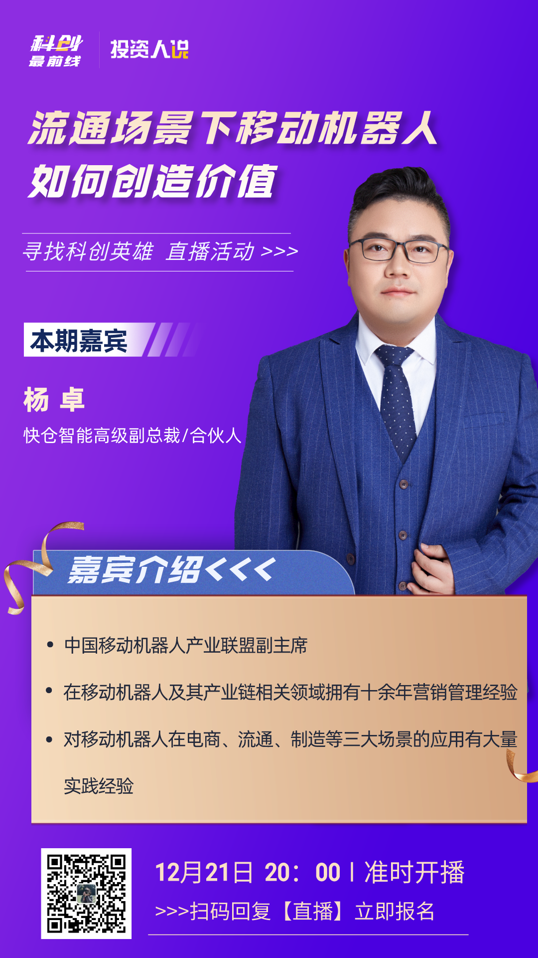 12月21日,20:00-21:00【科創(chuàng)最前線&投資人說】直播間快倉智能邀您共赴智慧物流征途(掃描海報中二維碼預(yù)約報名)
