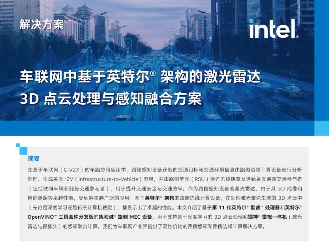 近日,英特爾完成了車聯(lián)網(wǎng)中基于英特爾架構(gòu)的激光雷達(dá)3D點(diǎn)云處理與感知融合方案白皮書(shū)的審核,對(duì)外公開(kāi)了路側(cè)感知和路側(cè)邊緣計(jì)算解決方案。
