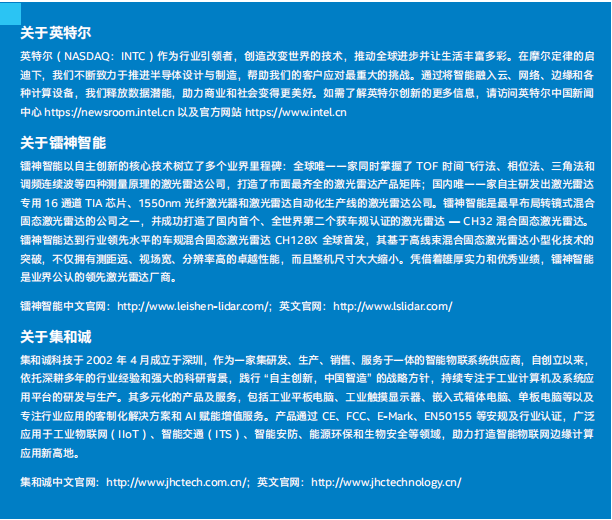 此次鐳神智能與英特爾及集合誠(chéng)的合作,加速了相關(guān)產(chǎn)品與解決方案的研發(fā),有利于促進(jìn)基于車聯(lián)網(wǎng)的車路協(xié)同方案早日實(shí)現(xiàn)商用。
