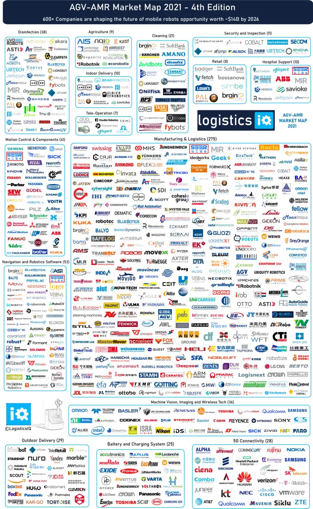 LogisticsIQ? 是國際公認(rèn)的權(quán)威機(jī)構(gòu),近日發(fā)布了最新的 LogisticsIQ? 市場圖譜,仙工智能登上《2021 全球 AGV/AMR 市場圖譜》、《2021全球倉儲(chǔ)自動(dòng)化市場圖譜》的 9 個(gè)版塊。仙工智能憑借專業(yè)的解決方案及優(yōu)異的產(chǎn)品力,讓一站式智能制造及智慧物流解決方案得到國際認(rèn)可。