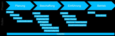 AGVS項目通常可以按時間順序劃分,如下圖所示,分為規(guī)劃階段、采購階段、介紹階段和運營階段。四個階段被分配了不同的角色。在這種情況下,角色被理解為在 AGVS 項目期間由組織單位或個人承擔(dān)的職能。
