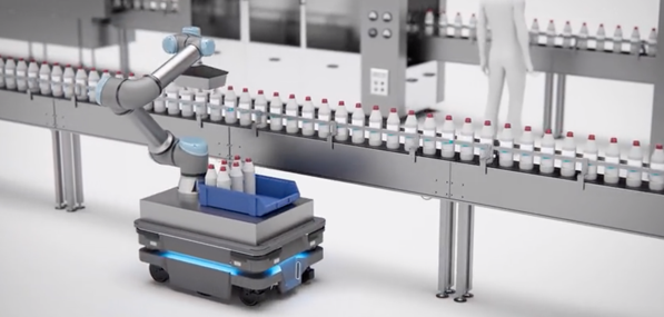 以快銷品行業(yè)為例,面對產(chǎn)品品類繁多,生產(chǎn)周期越來越短的情況,生產(chǎn)制造需要滿足市場交貨期更短、更準(zhǔn)時及價格壓力更大的多層次要求。車間作為任何制造型企業(yè)的中心,其效率管理好壞,直接影響著產(chǎn)品“質(zhì)量、成本、交貨期”各項指標(biāo)的完成。搭配UR機(jī)械臂的MiR AMR, 可以肩負(fù)起在產(chǎn)線自主移動,實現(xiàn)從生產(chǎn)線到質(zhì)檢實驗室及存儲區(qū)域的質(zhì)檢樣本自動揀選與運(yùn)輸自動化,簡化了相關(guān)工作流程,從而幫助產(chǎn)線提升效率。