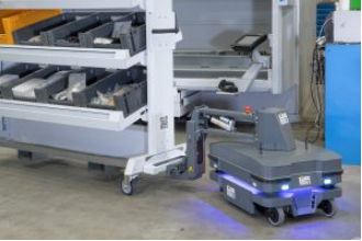 MiR AMR 與 Modula 自動垂直倉庫相結(jié)合,可以完全自主地收集、存儲和處理貨物。Modula 倉庫的 WMS 軟件和 MiR Fleet 相互交互,從而實現(xiàn)精確的操作同步。高架倉庫準(zhǔn)備好材料并將其放置在自己的裝卸臺中。MiR 機器人配備專用的頂部模塊,能夠拾取和存放裝有材料的抽屜,出現(xiàn)在托架前面并自主拾取抽屜,然后前往目的地并運送材料。該解決方案是模塊化和可擴展的,因為它能夠適應(yīng)具有不同特征的多種環(huán)境,這要歸功于安裝的快速性。
