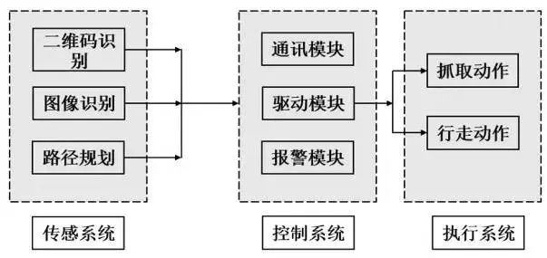 傳感系統(tǒng)包括二維碼識(shí)別、圖像識(shí)別和路徑規(guī)劃,控制系統(tǒng)包括通訊模塊、驅(qū)動(dòng)模塊和報(bào)警模塊,執(zhí)行系統(tǒng)包括抓取動(dòng)作和行走動(dòng)作。通過(guò)系統(tǒng)之間的相互協(xié)調(diào)與配合,可以實(shí)現(xiàn)物流搬運(yùn)機(jī)器人自動(dòng)獲取信息、自主抓取物品、按規(guī)劃路線行走及物流搬運(yùn)等功能。在設(shè)計(jì) AGV 的過(guò)程中,要充分考慮到這三大組成部分之間的聯(lián)系,繼而設(shè)計(jì)出符合設(shè)計(jì)條件的 AGV 機(jī)器人。