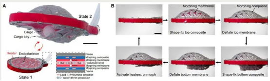 該圖顯示了分層材料,通過一個循環(huán)(B)來驅(qū)動,以制作一個可變形的潛艇。科學(xué)機器人