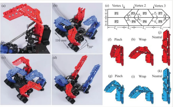 這些照片顯示了(b)在徑向夾持模式下的抓手,(c)圓柱形包裹模式,和(d)叉車模式,以及手指配置的說明