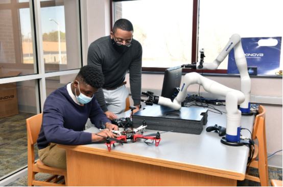 漢普頓大學(xué)教授安德魯-史密斯在機(jī)器人實(shí)驗(yàn)室內(nèi)協(xié)助大三學(xué)生蒙塔-威廉姆斯。| 來源:漢普頓大學(xué)
