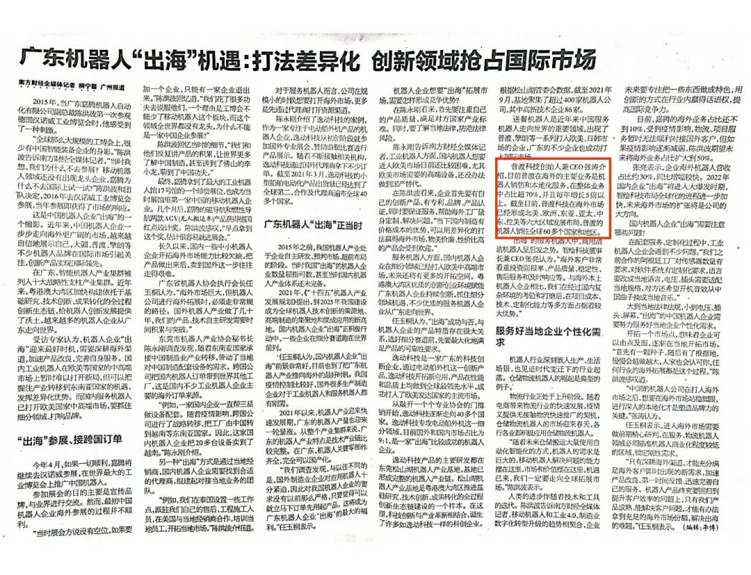 在廣東,智能機(jī)器人產(chǎn)業(yè)集群被列入十大戰(zhàn)略性支柱產(chǎn)業(yè)集群?;浉郯拇鬄硡^(qū)加快構(gòu)建依托于基礎(chǔ)研究、技術(shù)創(chuàng)新、成果轉(zhuǎn)化的全過(guò)程創(chuàng)新生態(tài)鏈,給機(jī)器人創(chuàng)新發(fā)展提供了沃土。機(jī)器人企業(yè)“出?!闭瓉?lái)最好時(shí)機(jī),需要深耕海外渠道,加速產(chǎn)品改良,完善自身服務(wù)。報(bào)道中受訪專家認(rèn)為,國(guó)內(nèi)工業(yè)機(jī)器人在歐美等國(guó)家的中高端市場(chǎng)中暫時(shí)難以打開新局,但可以把握住產(chǎn)業(yè)轉(zhuǎn)移到東南亞國(guó)家的機(jī)遇,發(fā)揮差異化優(yōu)勢(shì)。而國(guó)內(nèi)服務(wù)機(jī)器人已打開歐美國(guó)家中高端市場(chǎng),要抓住細(xì)分領(lǐng)域、打響品牌。送餐機(jī)器人是近年來(lái)中國(guó)服務(wù)機(jī)器人走向世界的一個(gè)重要細(xì)分領(lǐng)域。廣東的不少企業(yè)也成功打入歐美、日韓等國(guó)際市場(chǎng),其中以深圳普渡科技為突出代表。作為全球商用服務(wù)機(jī)器人“頭雁”企業(yè),普渡科技目前已經(jīng)在海外市場(chǎng)形成北美、歐洲、東亞、亞太、中東、拉美等六大區(qū)域發(fā)展布局,其機(jī)器人銷往全球60多個(gè)國(guó)家和地區(qū)。據(jù)普渡科技創(chuàng)始人兼CEO張濤介紹,目前普渡在海外的主要業(yè)務(wù)是機(jī)器人銷售和本地化服務(wù),在整體業(yè)務(wù)中占比超70%,并且每年增長(zhǎng)5倍以上。