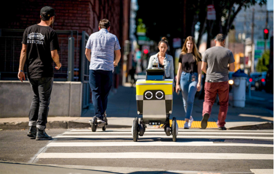 Serve機(jī)器人公司使用自主移動機(jī)器人向客戶運(yùn)送物品,同時與行人共享人行道。| 資料來源:Serve Robotics