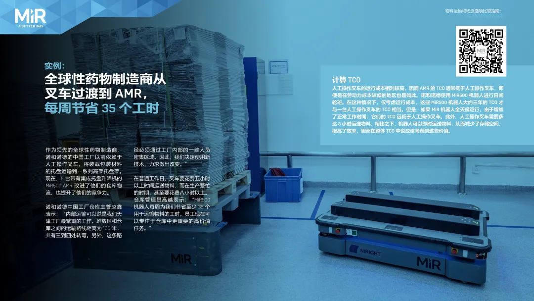 作為領(lǐng)先的全球性藥物制造商,諾和諾德的中國(guó)工廠以前依賴(lài)于人工操作叉車(chē),將裝載包裝材料的托盤(pán)運(yùn)輸?shù)揭幌盗懈呒芡斜P(pán)架。現(xiàn)在,5 臺(tái)帶有集成托盤(pán)升降機(jī)的MiR500 AMR 改進(jìn)了他們的倉(cāng)庫(kù)物流,也提升了他們的競(jìng)爭(zhēng)力。諾和諾德中國(guó)工廠倉(cāng)庫(kù)主管趙鑫表示:“內(nèi)部運(yùn)輸可以說(shuō)是我們天津工廠最繁重的工作。堆放區(qū)和倉(cāng)庫(kù)之間的運(yùn)輸路線距離為 100 米,共有三到四處轉(zhuǎn)彎。另外,這條路徑必須通過(guò)工廠內(nèi)部的一些人員密集區(qū)域。因此,我們決定使用新技術(shù),力求做出改變?!痹谄胀üぷ魅?,叉車(chē)要花費(fèi)五小時(shí)以上時(shí)間運(yùn)送物料,而在生產(chǎn)繁忙的時(shí)期,甚至要花費(fèi)八小時(shí)以上。倉(cāng)庫(kù)管理員高越表示:“MiR500機(jī)器人每周為我們節(jié)省至少 35 個(gè)用于運(yùn)輸物料的工時(shí)。員工現(xiàn)在可以專(zhuān)注于倉(cāng)庫(kù)中更重要的高價(jià)值任務(wù)?!?/p>