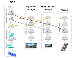 為了處理這兩種類型的數(shù)據(jù),團(tuán)隊(duì)轉(zhuǎn)向一系列預(yù)處理步驟。3D 點(diǎn)云數(shù)據(jù)通過(guò) PointPillars 運(yùn)行,PointPillars 是一種用于將數(shù)據(jù)轉(zhuǎn)換為偽圖像的系統(tǒng),可以使用為二維數(shù)據(jù)設(shè)計(jì)的卷積神經(jīng)網(wǎng)絡(luò) (CNN) 進(jìn)行進(jìn)一步處理,每個(gè)點(diǎn)添加一個(gè)時(shí)間指示器以創(chuàng)建包括運(yùn)動(dòng)在內(nèi)的更密集的表示。還使用了轉(zhuǎn)換為固定大小的表示,有效地對(duì)點(diǎn)云進(jìn)行二次采樣——這種方法在數(shù)據(jù)稀疏的地方使點(diǎn)云變密,在數(shù)據(jù)密集的地方使其稀疏,從而提高遠(yuǎn)距離的性能。