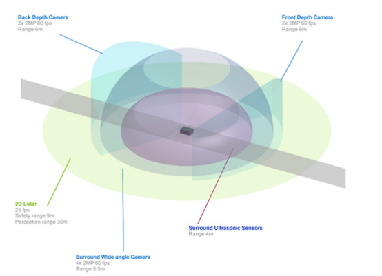 它的兩個(gè)Jetson AGX Orin單元為感知、導(dǎo)航和人機(jī)互動(dòng)提供了高達(dá)550 TOPS的AI計(jì)算。這些模塊實(shí)時(shí)處理來自AMR中樞神經(jīng)系統(tǒng)的數(shù)據(jù)--基本上是由多達(dá)六個(gè)攝像頭、三個(gè)激光雷達(dá)和八個(gè)超聲波傳感器組成的傳感器套件。