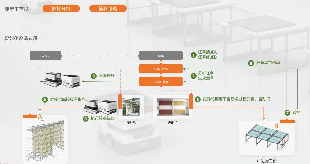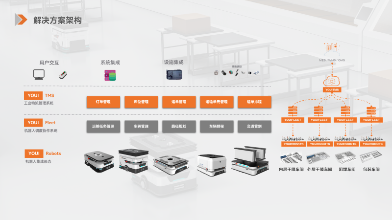 在移動(dòng)機(jī)器人基礎(chǔ)上,優(yōu)艾智合智慧物流管理系統(tǒng)YOUI TMS與企業(yè)MES、WMS等信息化系統(tǒng)對(duì)接,100%追蹤回溯每一件物料信息,完成物料從備料倉到產(chǎn)線再到成品倉的完整閉環(huán),在提質(zhì)增效的基礎(chǔ)上幫助企業(yè)實(shí)行柔性生產(chǎn)與數(shù)字化管理。