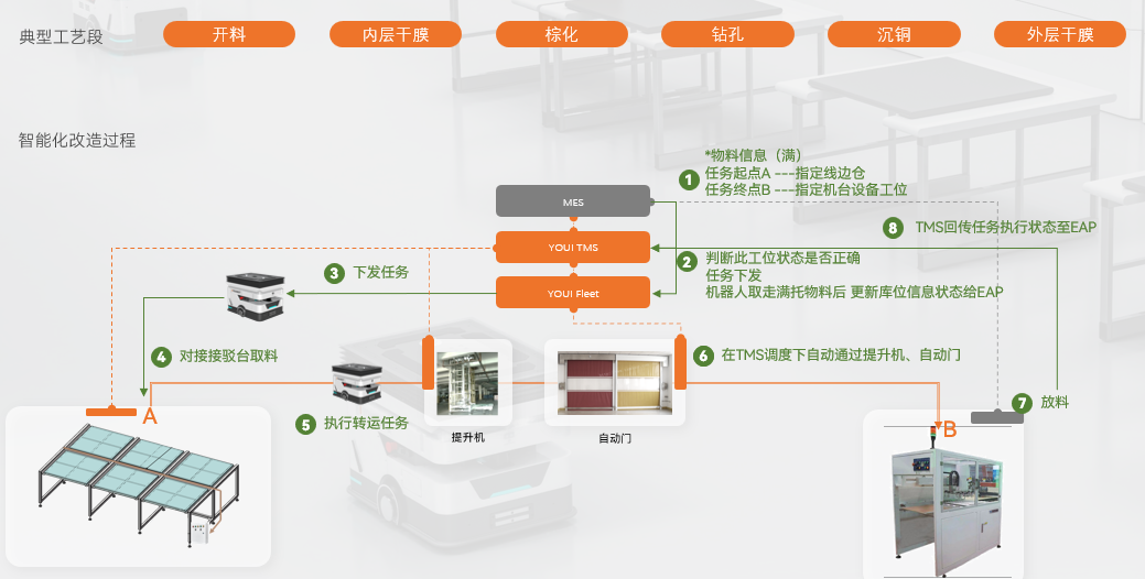 針對(duì)該P(yáng)CB軟硬結(jié)合板制造工廠,優(yōu)艾智合引入84臺(tái)移動(dòng)機(jī)器人及YOUI TMS智慧物流管控系統(tǒng),實(shí)現(xiàn)全場物質(zhì)流與數(shù)據(jù)流的打通。