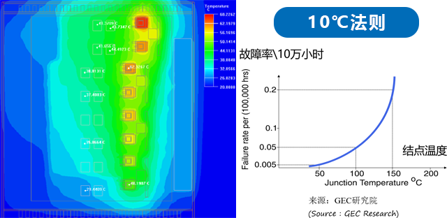 MRC5000在設(shè)計(jì)之初也遇到了很大的難題。一方面要滿足IP65的防護(hù)指標(biāo),不能留有縫隙等用于散熱,同時(shí)還要滿足運(yùn)行slam算法、運(yùn)動(dòng)控制算法、運(yùn)動(dòng)分解算法,內(nèi)置地圖任務(wù)路徑等一系列運(yùn)算需求,而產(chǎn)生大量的熱量。溫度對(duì)元器件失效率的影響很大,對(duì)微電路來(lái)說(shuō),溫度升高10℃–20℃約使溫度應(yīng)力系數(shù)增加一倍。為了保證器件在寬溫環(huán)境中具有足夠的使用壽命,需要進(jìn)行降額設(shè)計(jì)、熱設(shè)計(jì);另外為了降低溫度引發(fā)元器件參數(shù)漂移的影響還需要進(jìn)行容差分析。