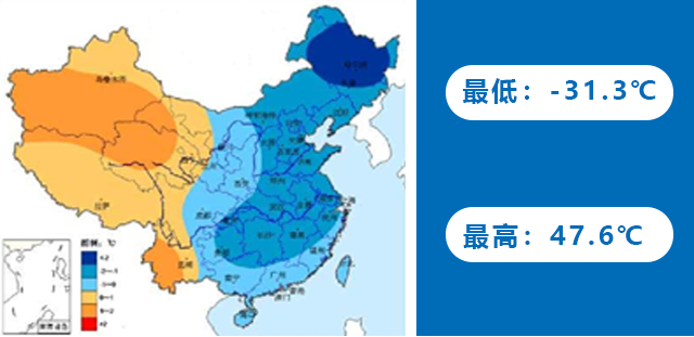 中國(guó)是一個(gè)幅員遼闊的國(guó)家,中國(guó)最南端最高溫度可達(dá)47.6℃,最北端最低溫度低至-31.3℃。既有像海上采油采氣平臺(tái)這樣潮濕晝夜溫差不大的環(huán)境,也有像在沙漠、戈壁的航天發(fā)射中心這樣晝夜溫差極大的環(huán)境。