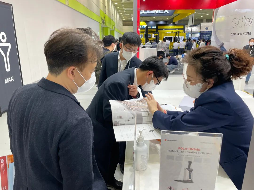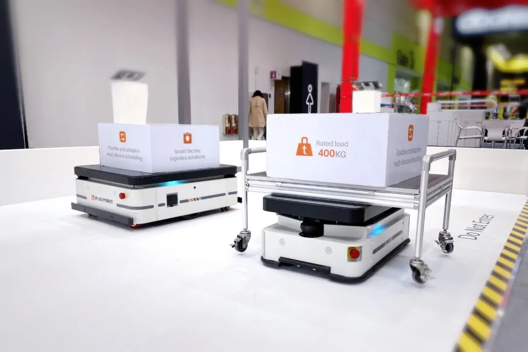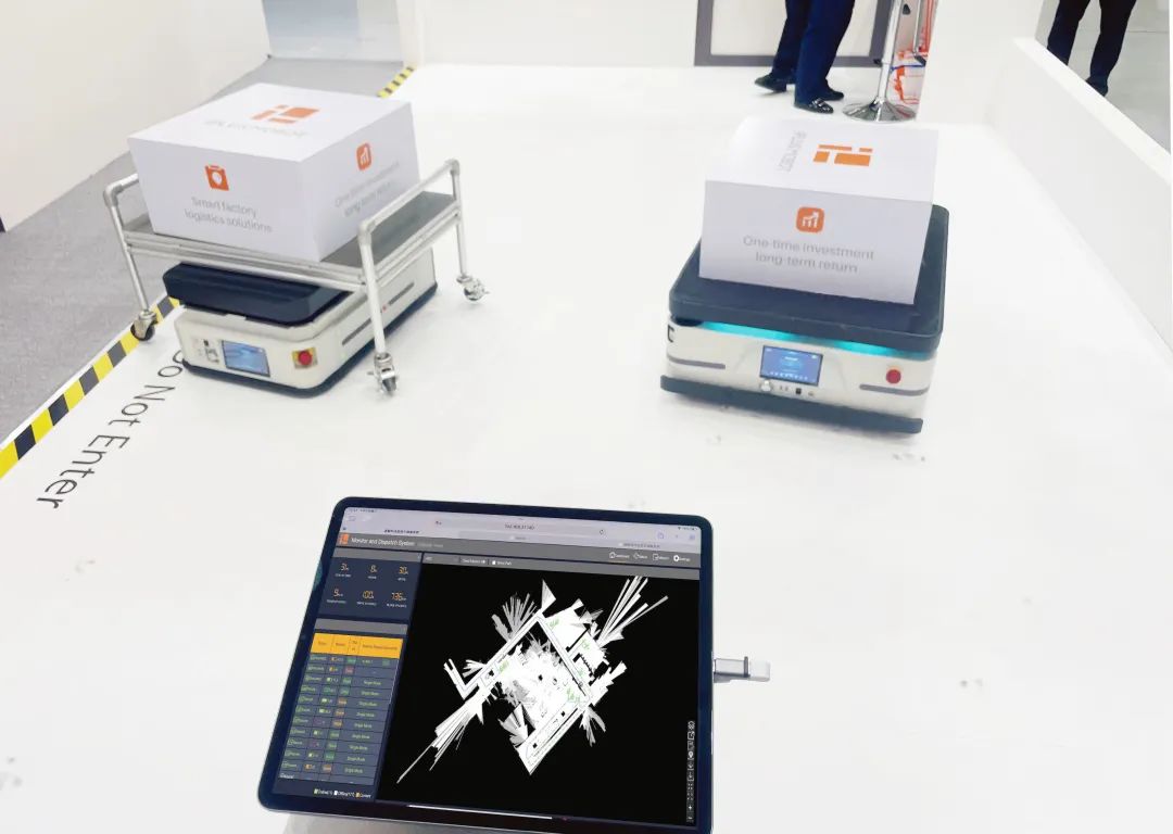 展會現(xiàn)場,采用迦智自研融合導(dǎo)航技術(shù)的EMMA移動機器人車隊,對接不同料架,在多機器人調(diào)度管理系統(tǒng)的統(tǒng)一管控下,結(jié)合智能的控制算法,準(zhǔn)確、高效地完成物料的柔性周轉(zhuǎn)。