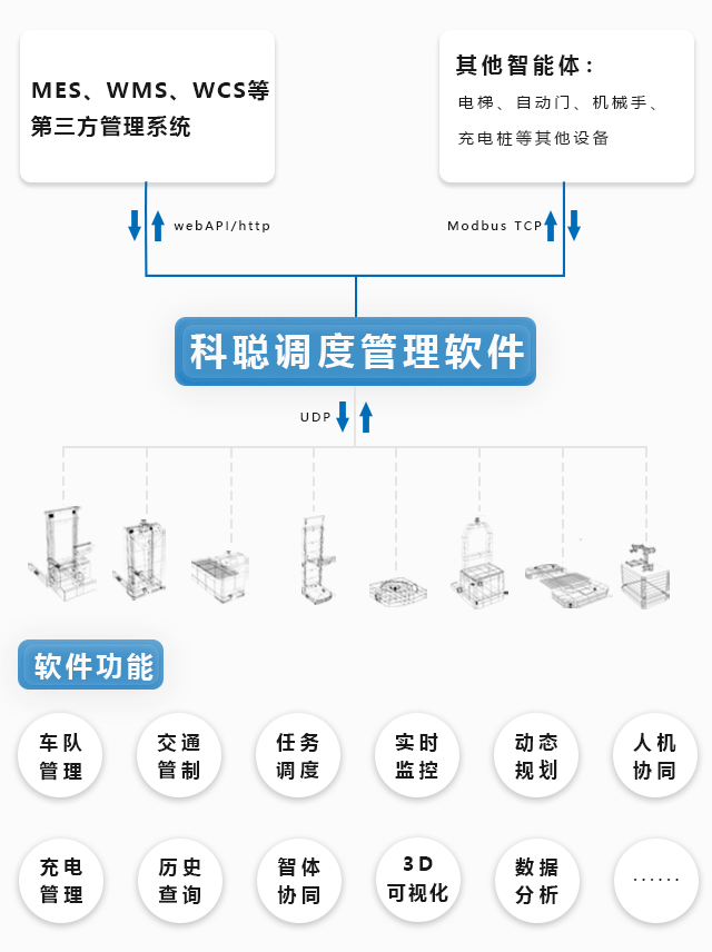 科聰調(diào)度軟件具有對智能機器人與智能機器人、智能機器人與自動化設(shè)備、智能機器人集群與集群間、智能機器人與人相互協(xié)同工作,從而發(fā)揮出移動機器人應(yīng)用的最大效能。包括現(xiàn)場常見的電梯(升降設(shè)備)、自動門、機械手、充電樁等設(shè)備協(xié)同調(diào)度。